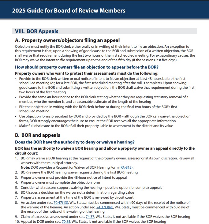 | Every municipality in Wisconsin holds a Board of Review (BOR) to finalize the assessment roll, which serves as the basis for property tax calculations. This important process ensures that property assessments are accurate, fair, and equitable across the community. What is the Board of Review?The Board of Review operates much like a court hearing. Its purpose is to verify the accuracy of the assessment roll and hear any formal objections from property owners who believe their property has been incorrectly assessed. During the hearing, only the property owner and the assessor may present evidence. The Board may ask questions to better understand the case, but decisions must be based solely on the evidence provided during the proceeding. If the property owner does not provide sufficient evidence to support their claim, the assessor’s value is presumed to be correct. Key Components of the Board of Review Process: Guide to the Board of ReviewAll BOR members are required to follow procedures outlined by the Wisconsin Department of Revenue (DOR). This guide ensures consistency and fairness in every municipality. Click here to read the DOR’s Guide to Board of Review The Assessment RollThe Assessment Roll is the official record listing all taxable properties within the municipality along with their assessed values. These assessments, made annually by the municipal assessor, aim to reflect each property’s fair market value. Property owners are notified of their assessments in advance and may review the roll at their local municipal office. Board of Review MeetingsThese meetings provide a formal setting where property owners can challenge their assessed values. The BOR is typically made up of elected officials and trained local residents listen to both sides before making a decision. Meetings are publicly noticed, and appeals must follow strict procedural steps to be considered. Roles & Responsibilities The Municipal ClerkThe clerk plays a pivotal role in coordinating the BOR process. Key duties include:Notifying property owners of their assessmentsScheduling hearingsEnsuring legal and procedural requirements are metRecording all proceedings and decisions The AssessorThe assessor is responsible for:Determining property values based on fair market conditionsJustifying these values using sales data, property characteristics, and adjustmentsIf no compelling evidence is presented to challenge an assessment, the assessor’s value stands. The Property OwnerTo challenge an assessment, the property owner must present clear, credible evidence such as:Recent sales of comparable propertiesIndependent appraisalsUnique property conditions that affect valuePreparation and documentation are essential for a successful appeal. Presenting and Evaluating EvidenceThe hearing begins with the property owner presenting their case, followed by the assessor’s response. BOR members may ask questions to fully understand the facts. No outside evidence may be considered—only what is presented during the hearing. Board of Review DecisionsAfter reviewing all evidence, the BOR will deliberate and make one of the following determinations:Uphold the existing assessmentLower the assessmentIncrease the assessment (if the evidence shows the property is undervalued)Decisions are then recorded, and any changes are reflected in the final assessment roll. Property owners are formally notified of the outcome. |
